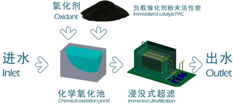 利用负载上过渡元素的粉末活性炭作为吸附及催化反应中心,促进氧化剂(H2O2、NaClO等)将废水中有机物及氨氮氧化去除。后续经过浸没式超滤可将全部催化剂回收,回收后的催化剂经热解处理后可循环利用,从而大大降低系统的运行费用。